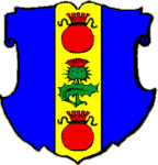 blauem Schild, in dessen oberen beiden Ecken zwei silberne gekreuzte Schlüssel